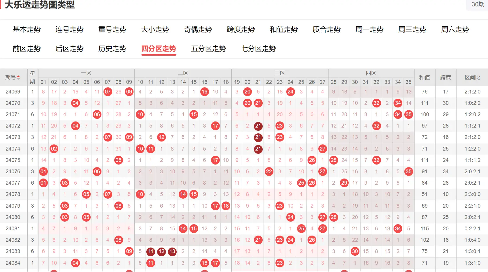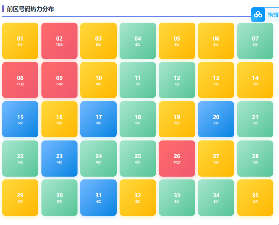 前区分三区(1-12、13-23、24-35),常见比例如2:2:1。连号出现率约60%。使用综合走势图监控三区均衡与连号趋势。